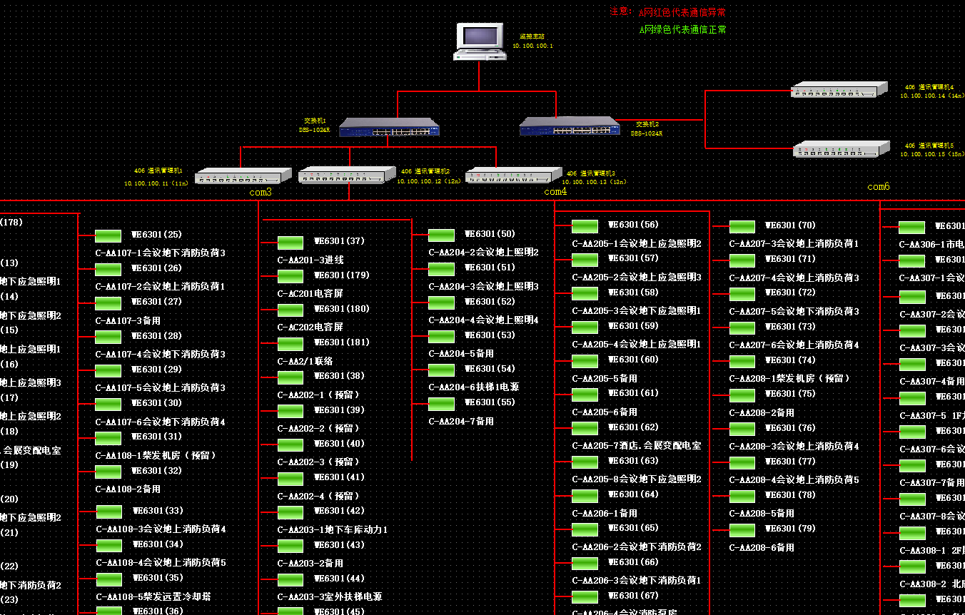 系統(tǒng)支持實時監(jiān)視接入系統(tǒng)的各設備通訊狀態(tài),能夠完整的顯示出整個系統(tǒng)網(wǎng)絡結構;也可在線診斷設備通訊狀態(tài),發(fā)生網(wǎng)絡異常時能自動在界面上顯示故障設備或元件及其故障部位。從而方便運行維護人員實時掌握現(xiàn)場各設備的通訊狀態(tài),及時維護出現(xiàn)異常的設備,保證系統(tǒng)的穩(wěn)定運行。