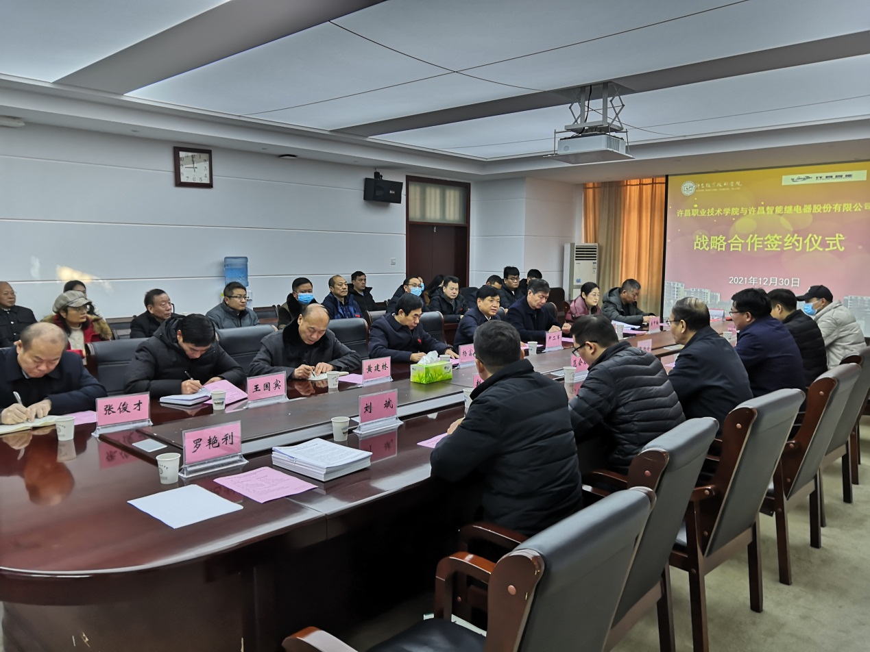 12月30日上午,許昌智能繼電器股份有限公司與許昌職業(yè)技術學院舉辦戰(zhàn)略合作簽約儀式,雙方圍繞電氣工程領域人才培養(yǎng)共建產(chǎn)業(yè)學院,公司董事長張洪濤、書記范會君、許昌職業(yè)技術學院黨委書記尹二軍、校長譚水木等領導出席儀式。